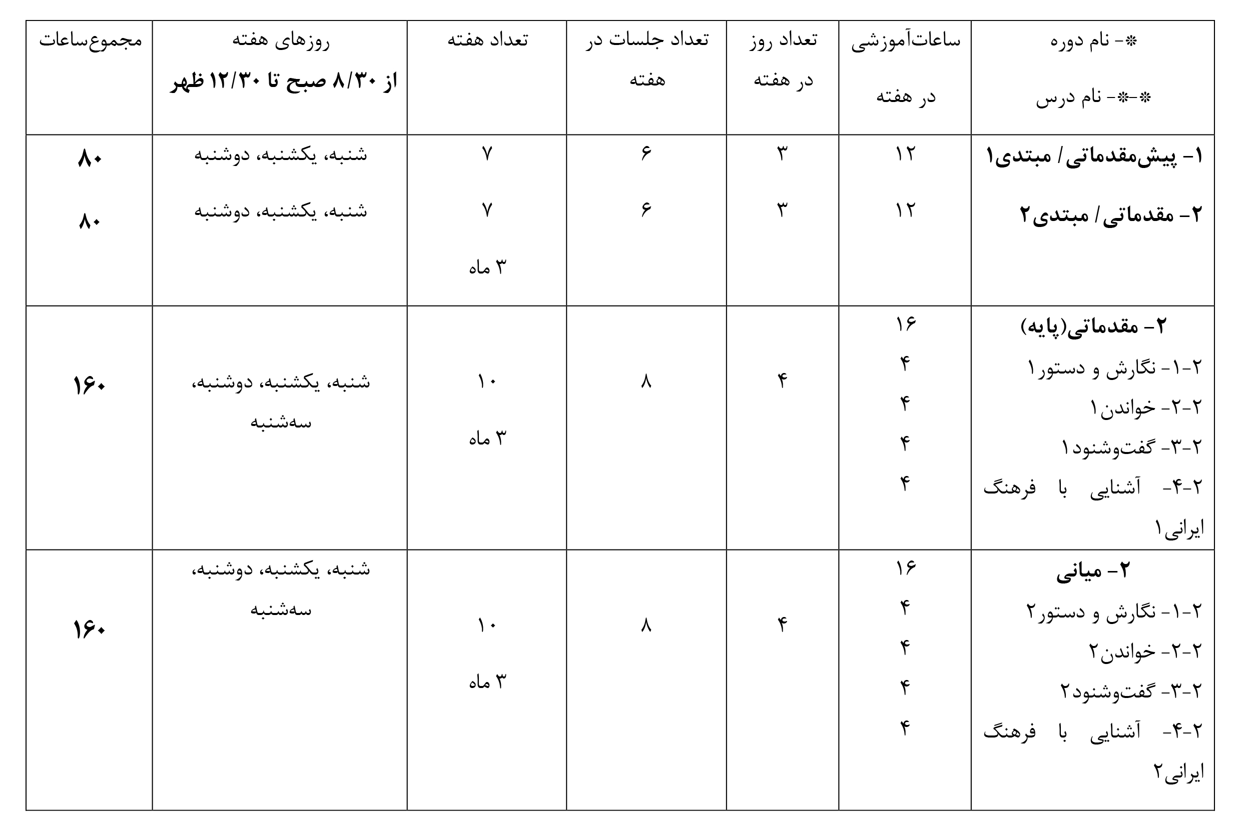جدول زمان بندی آغاز دورههای آموزش زبان فارسی مرکز آزفا